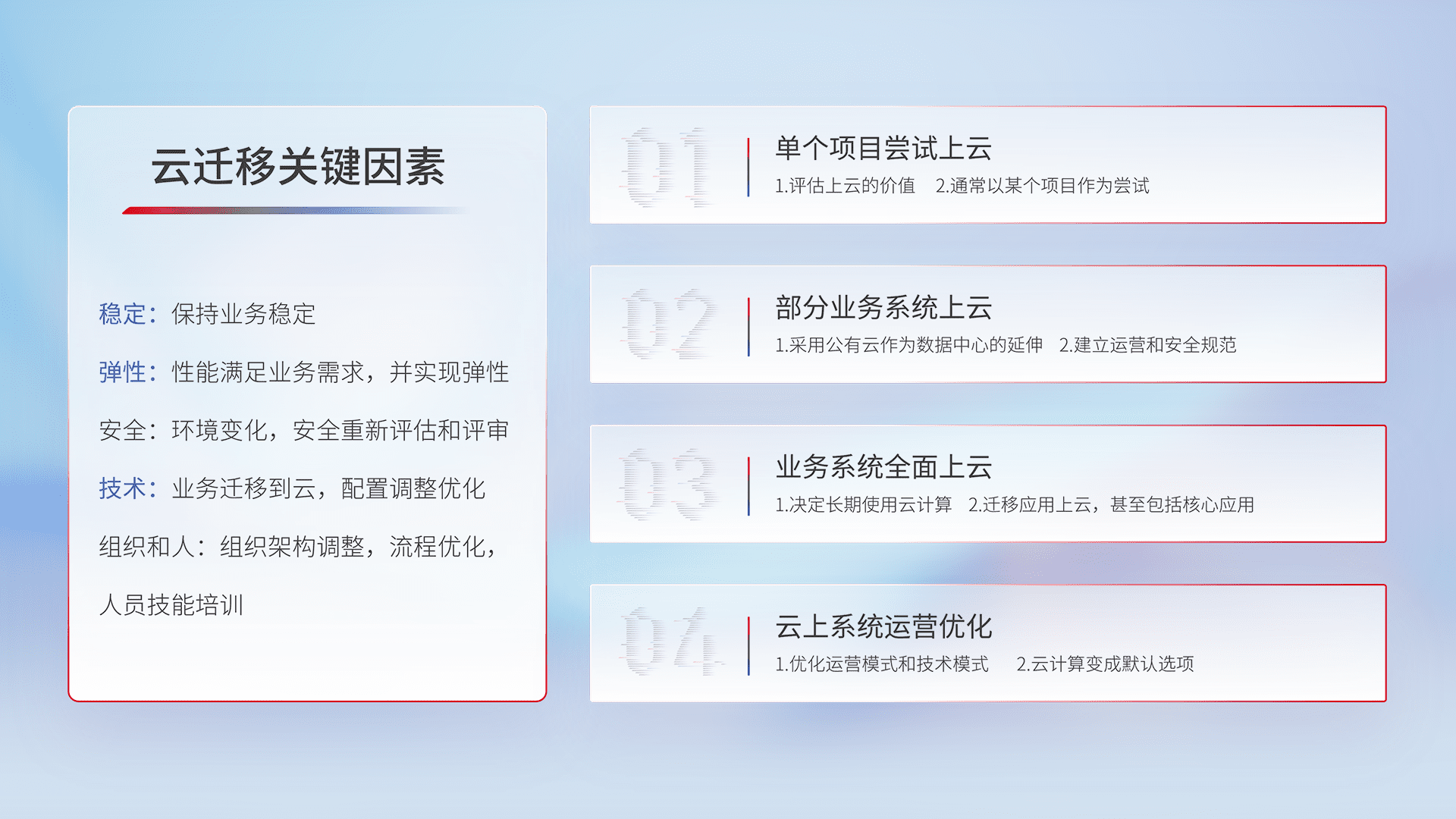 结合实际业务,,从规划设计、、、云平台选型、、、、云原生改造、、数据迁移、、、、集成交付,,,,迁移全过程为客户识别最佳上云路径,,,,做好风险识别管理,,,,设计网络架构、、、、身份权限、、、安全审计合规、、操作审计、、、、日志审计、、、、监控告警策略、、、、多站点容灾设计等,,对云上基础设施进行整体规划,,,提升IT治理水平,,以满足弹性、、高可用、、、高性能的需求。。。。