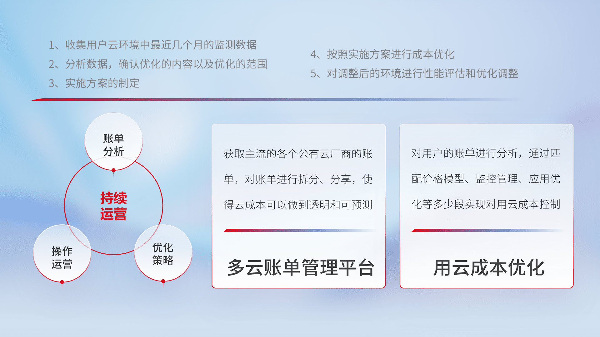 通过多云纳管,,以统一的资源数据模型把客户的云资源进行抽象和封装,,,进而实现对多云资源的统一操作,,保障云资源管理的可靠性、、、稳定性与可用性。。。量身定制化运维内容,,配置、、、、开发运维、、、补丁管理、、、备份、、、监控、、、认证和访问管理、、审计和日常巡检等,,保障在用云过程中的可靠度,,,,稳定度以及高可用率。。。